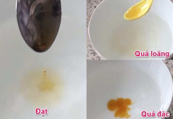 - Nếu giọt đường gom lại thành viên tròn thì nước đường đã bị nấu đặc quá. Bạn cần thêm nước vào và nấu đến khi đạt.