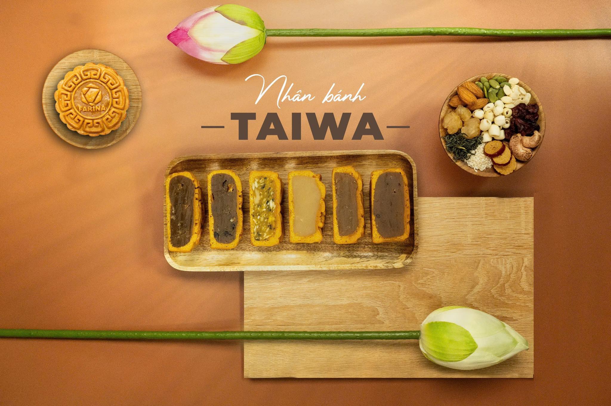 Là dòng nhân bánh cao cấp kiểu Đài Loan với 100% cốt từ hạt sen, Taiwa mang đến hương vị hiện đại với các thành phần long nhãn, táo đỏ, trà ông long, bưởi hồng, các loại hạt, ... nhiều giá trị dinh dưỡng, tốt cho sức khỏe.