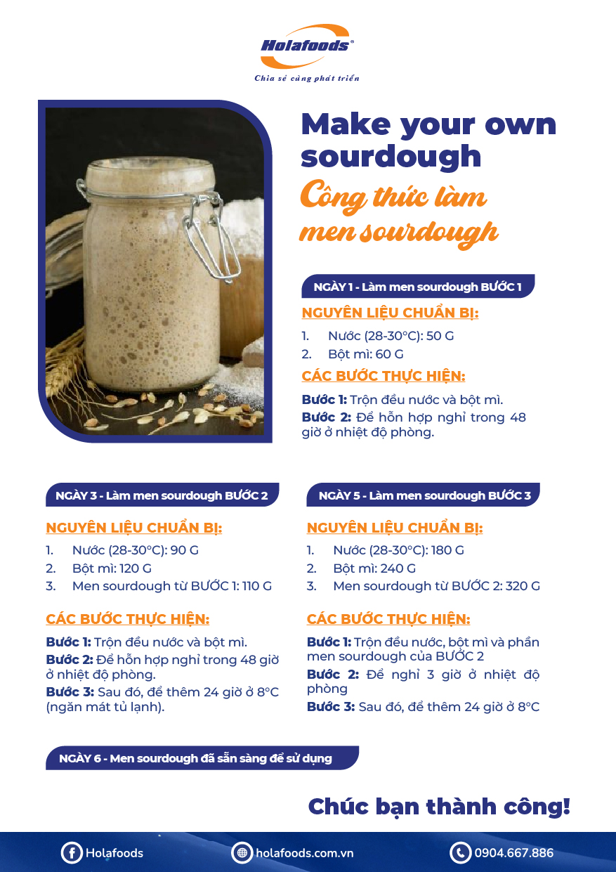 Làm được một ổ bánh chua tự nhiên (sourdough) ngon chính là bí quyết giữ chân khách hàng, vì mùi thơm, vị chua nhẹ đặc trưng và độ dai hoàn hảo của ruột bánh không thể thay thế bằng men công nghiệp. Công thức men sourdough dưới đây giúp thợ bánh tạo được starter khỏe – ổn định – chuẩn vị, thích hợp cho các dòng bánh mì artisan đang rất được ưa chuộng.